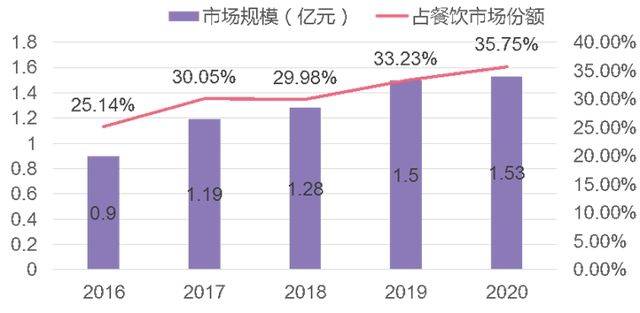 团餐作为餐饮业的重要组成部分,主要服务于学校、机关、事业单位、航空铁路配餐、养老餐等团体用餐需求。2020年受新冠疫情影响,团餐市场总额达1.53万亿元,团餐市场份额将达35.75%。