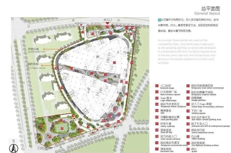 项目设计以扬州市花——琼花花瓣为灵感,定位家庭时尚潮流生活中心:地下2层规划有超市和1600多个停车位的大型车场;地上3层引进潮流运动旗舰店、特色餐饮、娱乐休闲、儿童亲子等业态。