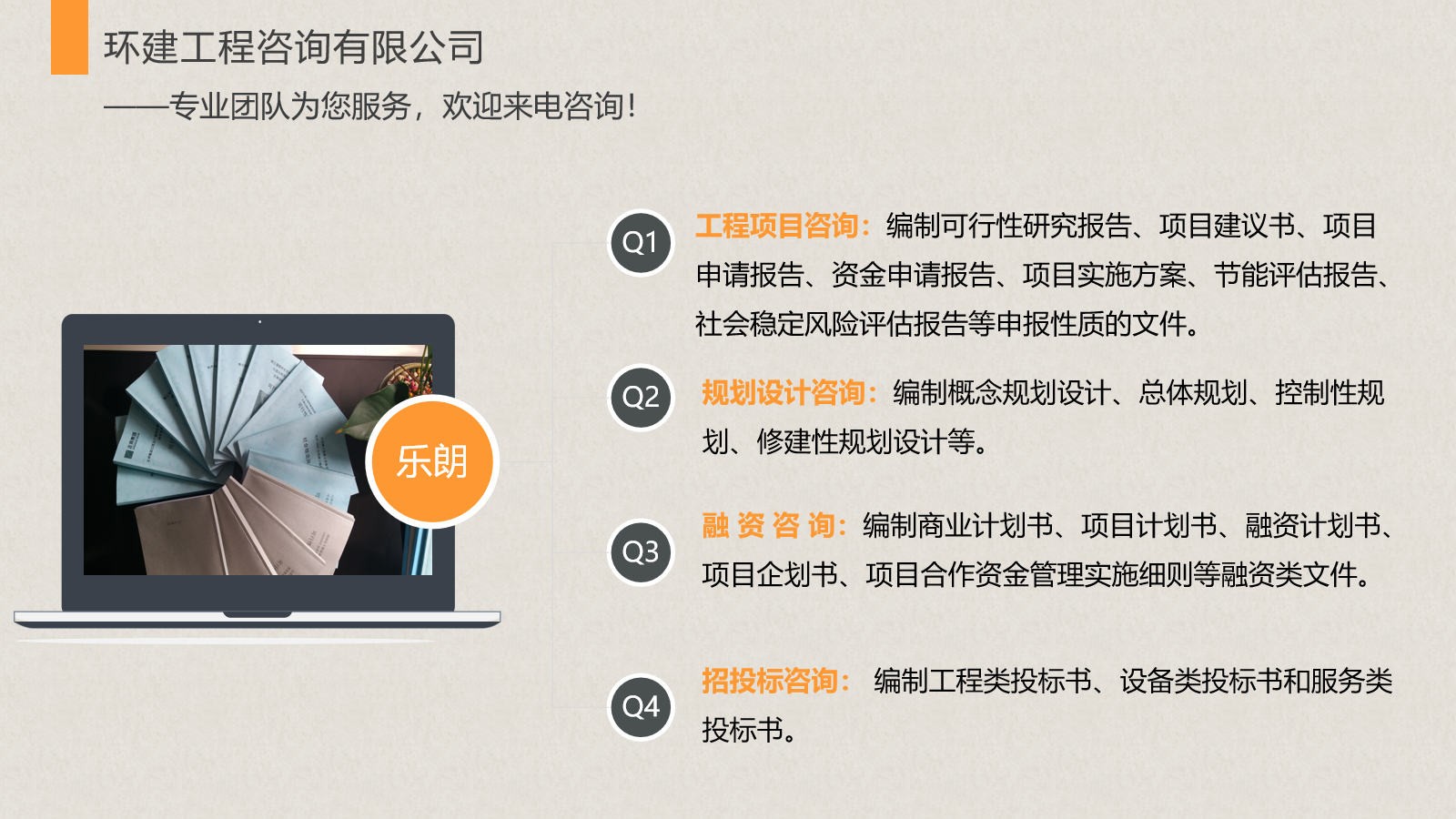 环建工程咨询有限公司在政务、社会和经济领域的信息化建设中拥有着强大的技术实力和资源优势,为客户提供:可行性研究报告、项目建议书、资金申请报告、节能评估报告、商业计划书、稳定评估报告、招投标书等。”
