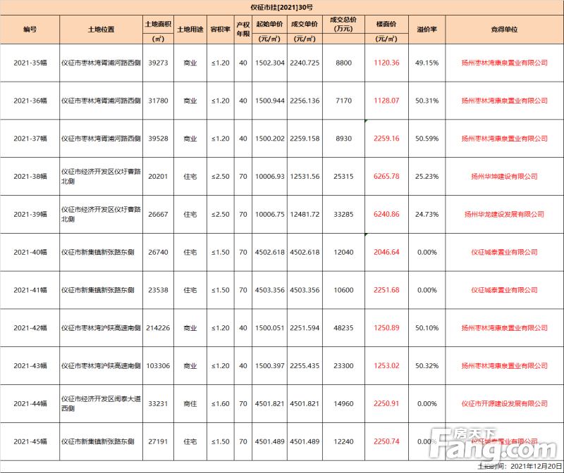 2021-45幅地块被仪征城泰置业有限公司竞得,成交总价为12240万元,楼面价约为2250.74元/平米;该地块位于仪征市新集镇新张路东侧,占地面积为27191平米,为住宅用地,容积率≤1.50,产权年限为70年。