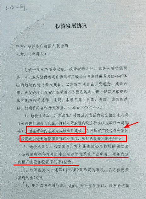 竞得企业要在广陵开发区投资或者引进总投资额不低于5亿元的电池管理系统产业项目,并且要在半年内开工建设,两年内投资不低于1亿元。如果不能完成,竞得企业需要支付2亿元的违约金。