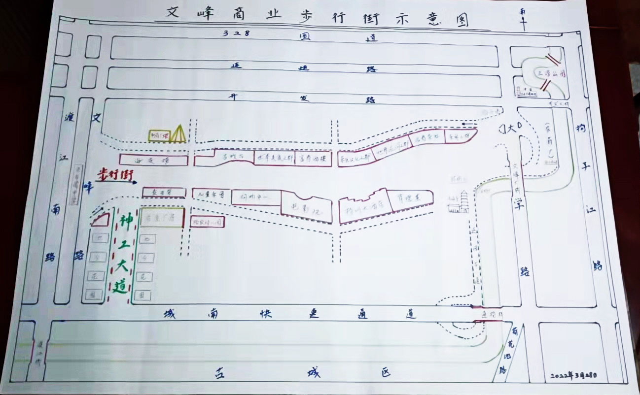 东南片区发展牵动社会各界的心。日前,热心市民杨家书带着自己设计的文峰路南段商业街手绘图来到报社,讲述了他的构想,如何充分利用东南片区的旅游资源,将东南片区景点串点成线,把文峰路南段打造成为商业步行街,发展东南片区旅游经济。